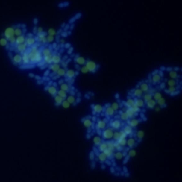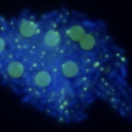 Bifidobacterium lactis NORDBIOTIC™ BI040 with 2 μm microspheres – large fluorescent beads attached to bacterial clusters